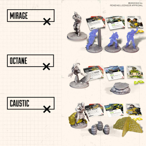 6 miniature Leggenda: Caustic, Cripto, Mirage, Octane, Revenant, Wattson; 15 miniature Effetto della Leggenda: Trappola gas Nox x3, Granata gas Nox, Drone di sorveglianza, Ologramma di Mirage x3, Trampolino, Dispositivo del Silenzio, Totem della Morte, Traliccio d’Intercettazione, Nodo di Recinzione x4; 48 carte Impresa