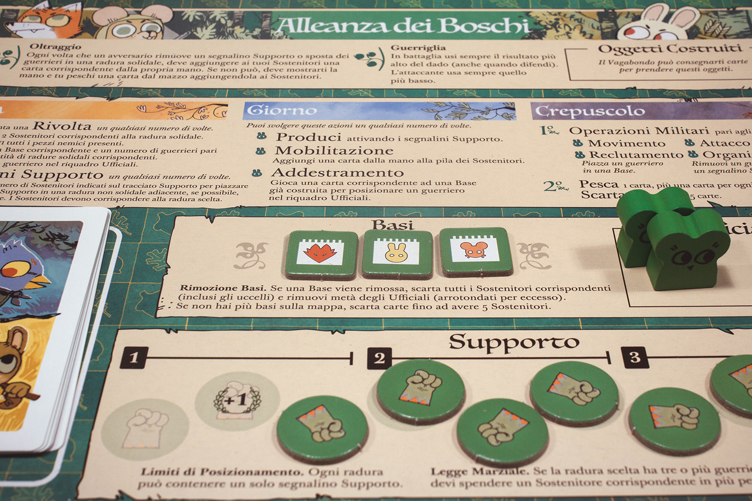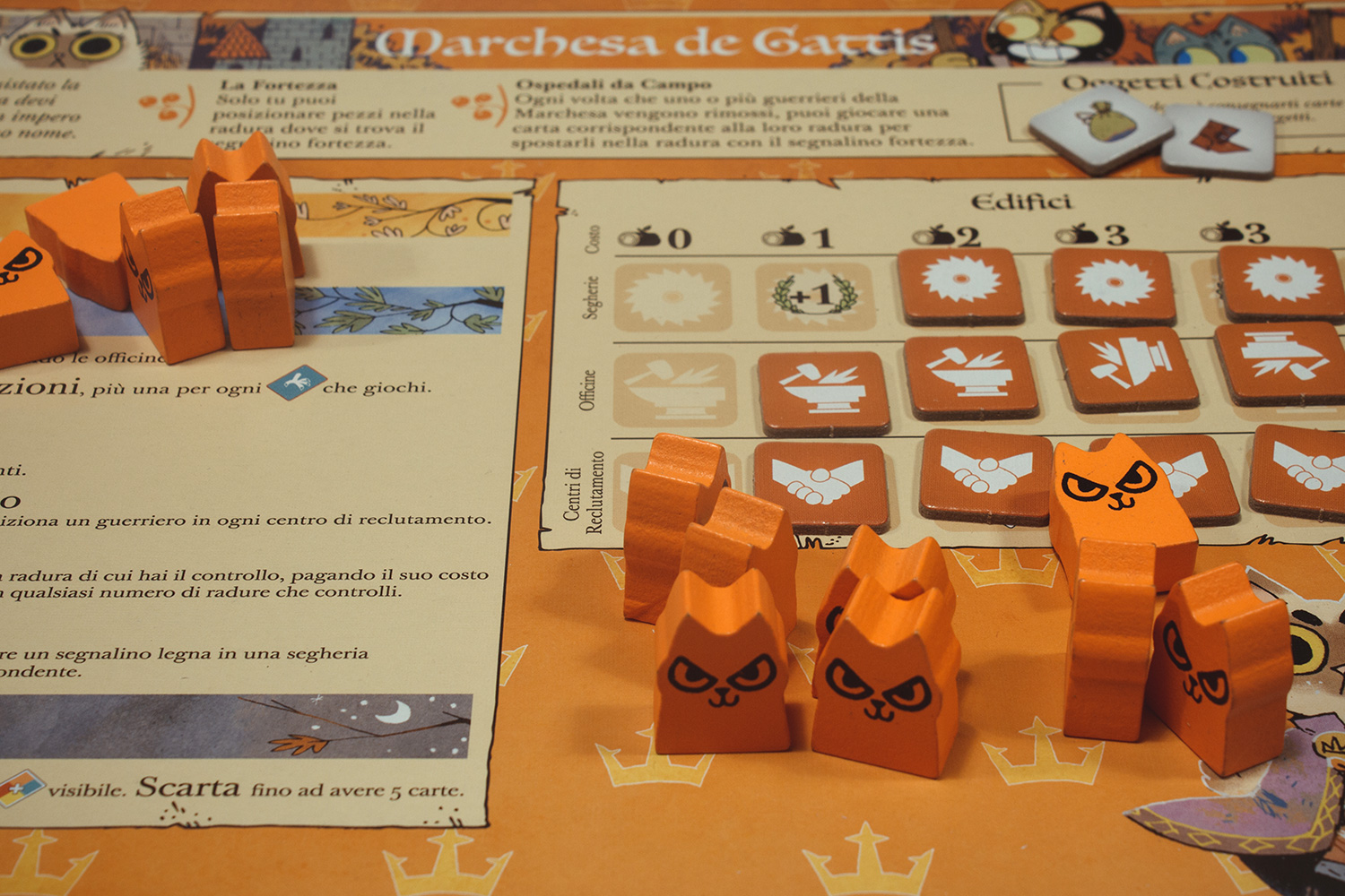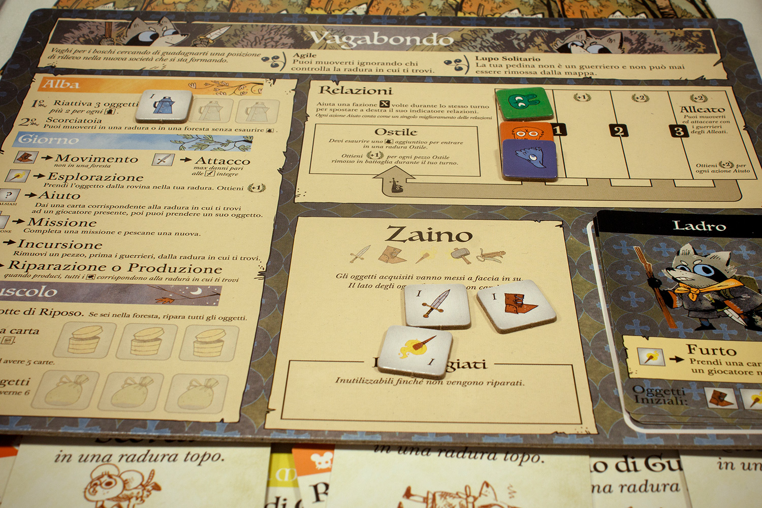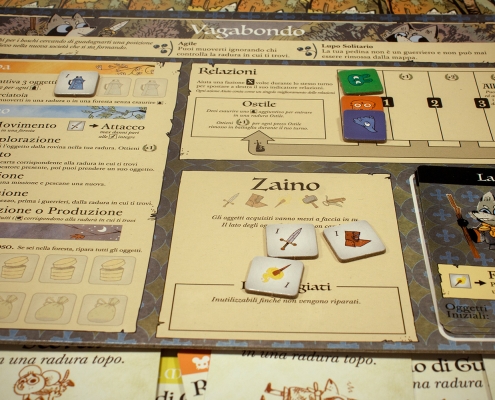 Regolamenti. Guida Rapida. Pezzi in Cartone. 15 Edifici (15 Giardini), 9 Segnalini (9 Avamposti Commerciali), 3 Indicatori Punteggio, 1 Indicatore Reietto, 9 Indicatori Relazione, 11 Oggetti (3 Stivali, 3 Spade, 1 Sacco, 1 Martello, 1 Torcia, 1 Pila di Monete, 1 Balestra), 17 pezzi aggiuntivi (con lettere sul retro per scenari futuri). Pezzi in Legno. 40 Guerrieri (25 Setta, 15 Compagnia), 1 Pedina Vagabondo. Carte. 4 Spie, 2 Riassunto delle Fazioni, 3 Personaggi del Vagabondo. Altro. 4 Plance delle Fazioni (Secondo Vagabondo, Marchesa Meccanica, Compagnia del Fiume, Setta delle Lucertole), 3 indicatori Servizio, 1 Porta-carte.